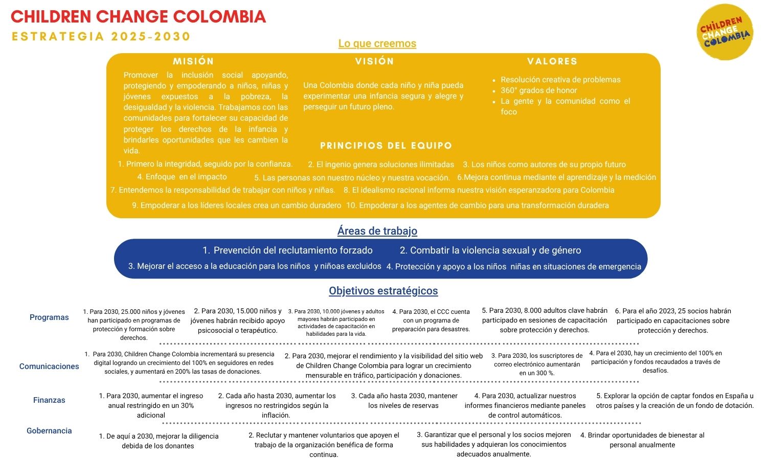El Plan Estratégico 2025-2030 de Children Change Colombia establece la misión y los valores institucionales que marcan la conducta del equipo de CCC, su visión de futuro, las directrices estratégicas y los respectivos objetivos que guiarán a la organización durante los próximos cinco años.